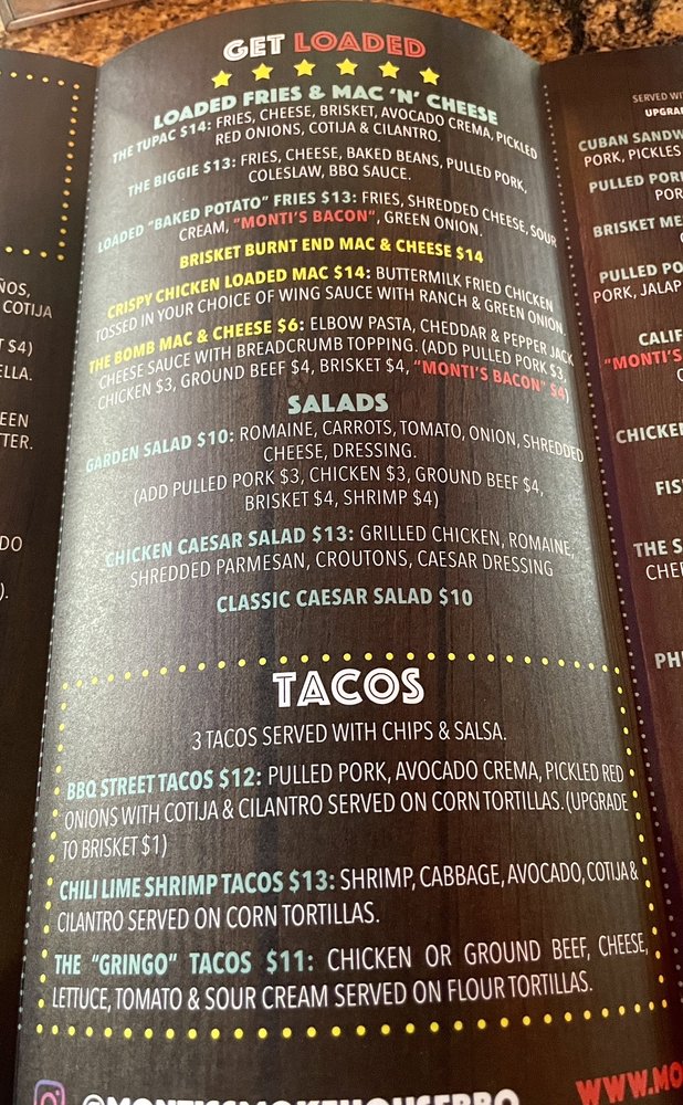 Welcome to Monti's Smokehouse BBQ Gourmet Food Truck and Catering, where tantalizing flavors and exceptional service come together in Las Vegas. Located at 8410 W Desert Inn Rd, this food truck offers an enticing menu designed to satisfy your cravings. Start your day with a hearty Breakfast Sandwich featuring Monti's bacon, sausage, or ham, paired with eggs and breakfast spuds for just $9. The mouthwatering Chicken Wings, brined with a secret mix and served with a variety of sauces, are a must-try, alongside their indulgent Nachos topped with pulled pork or chicken.